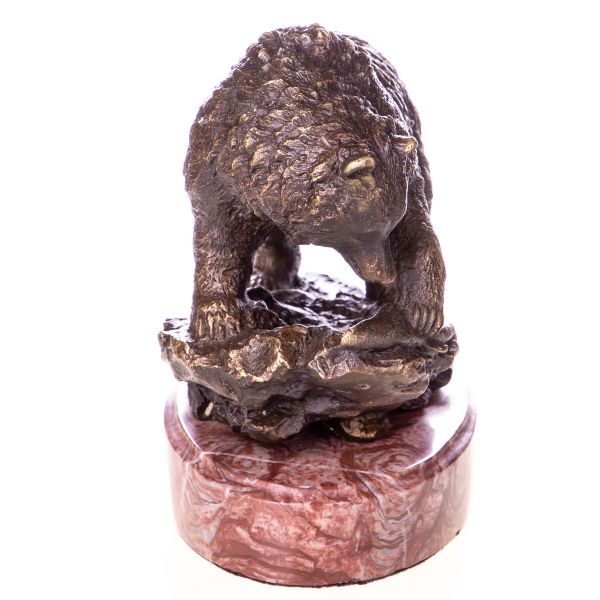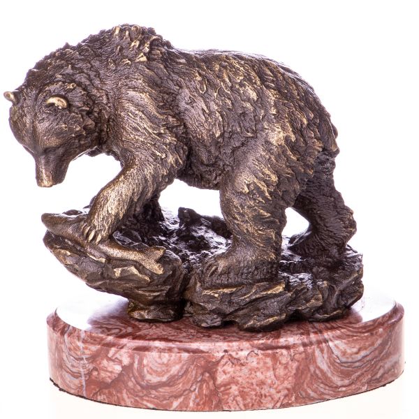 Ručně odlitá bronzová socha medvěda s rybou na mramorovém podstavci