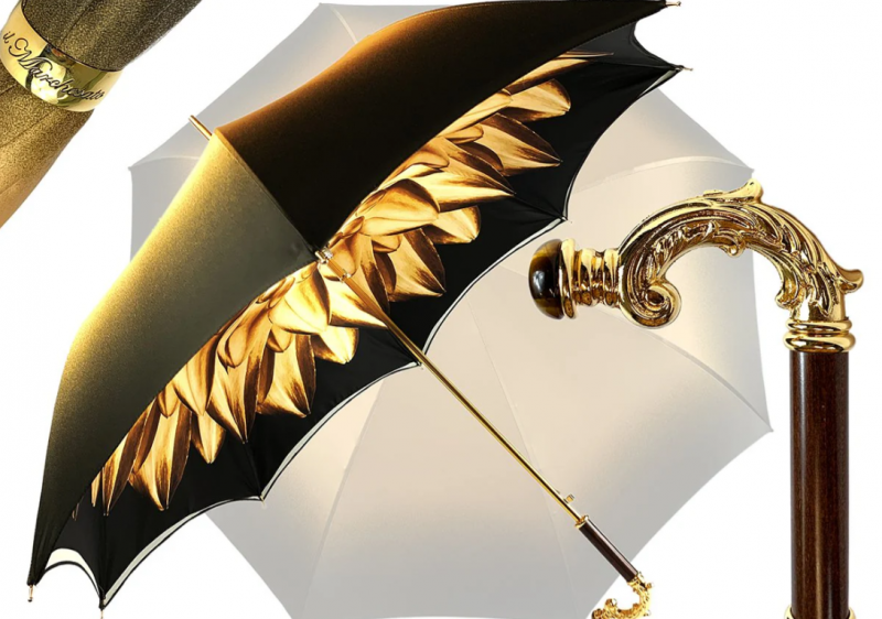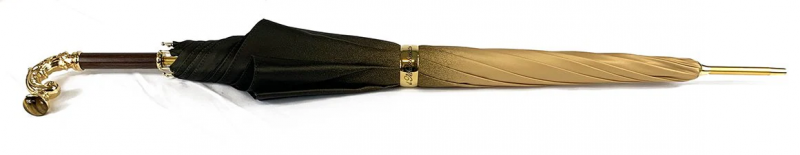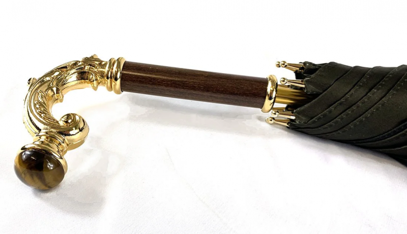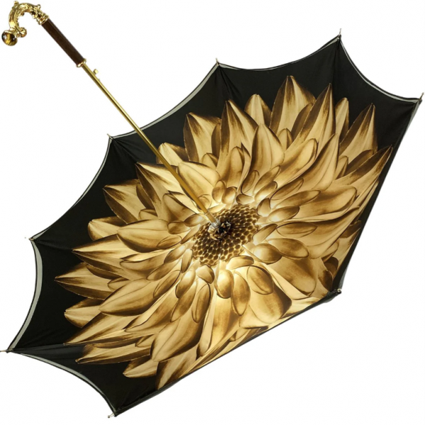 Elegantní a stylový ručně vyrobený dvojitý látkový deštník pro ženy v jemné zlaté barvě z polyesterového saténu. Všimněte si nového vzoru jiřin uvnitř, potištěného na černém pozadí, a exkluzivního nového modelu mosazné rukojeti s velkým kamenem tygří oko.