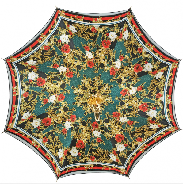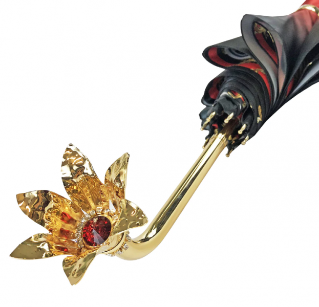 Nádherný ručně vyrobený dámský deštník z jemného polyesterového saténu, podobného hedvábí, s exkluzivním designem uvnitř. Deštník má pozlacenou rukojeť zdobenou Swarovski krystaly