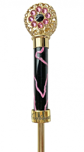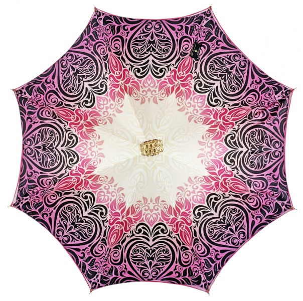 Nádherný ručně vyrobený dámský deštník z jemného polyesterového saténu, podobného hedvábí, s exkluzivním designem uvnitř. Deštník má pozlacenou rukojeť zdobenou Swarovski krystaly
