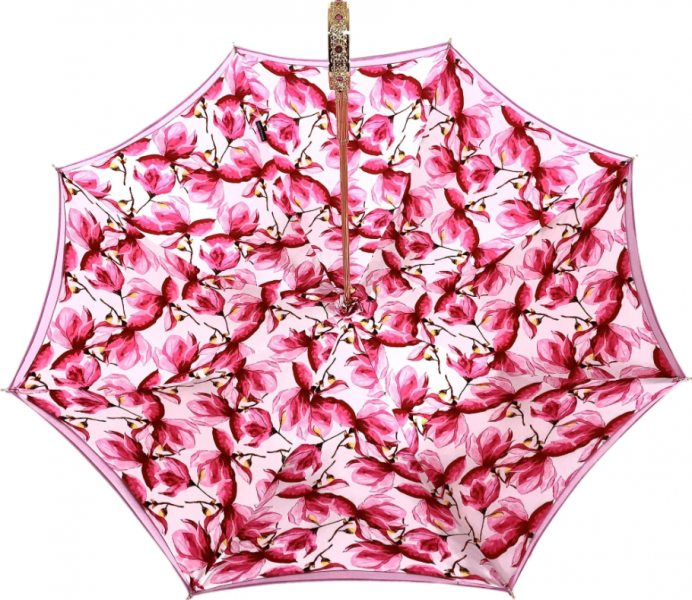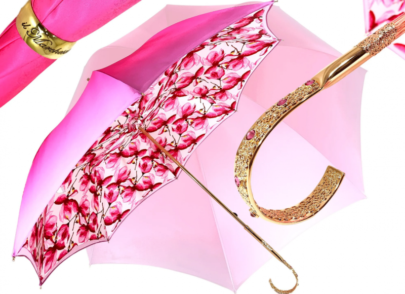 Nádherný ručně vyrobený dámský deštník z jemného polyesterového saténu, podobného hedvábí, s exkluzivním designem uvnitř. Deštník má pozlacenou rukojeť zdobenou kamínkem Swarovski a ručně ovládaný zlatý rám s elegantním zapínáním.