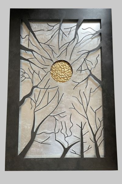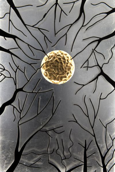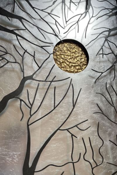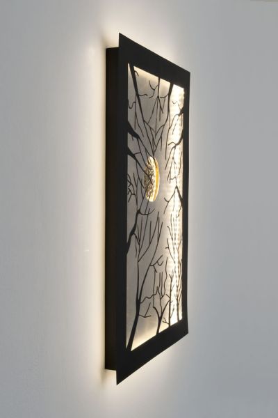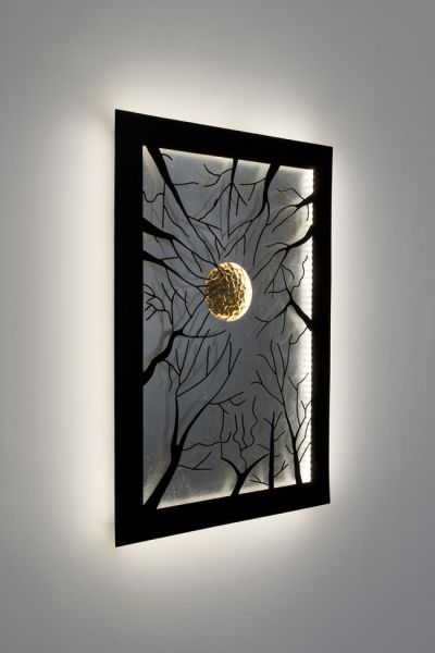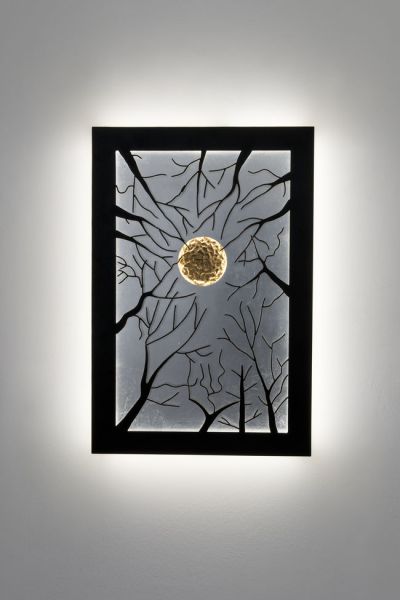 Tichá noc. Jako pohled na noční oblohu skrz koruny stromů v klidném lese. Tato nástěnná lampa zachycuje ticho a krásu noci v jedinečné hře světla. Tmavý železný rám s jemnými texturami připomínajícími stromy vytváří podmanivou siluetu, zatímco pozadí pokryté stříbrnými listy září tajemnou září. Zlatem tepaný měsíc tvoří zářivý střed této scény a zalévá místnost jemnou, snovou atmosférou. Umělecké dílo stvořené ze světla a stínu – plné klidu, hloubky a magie.