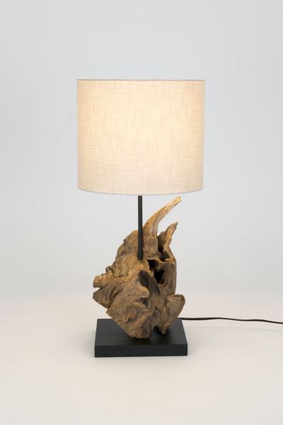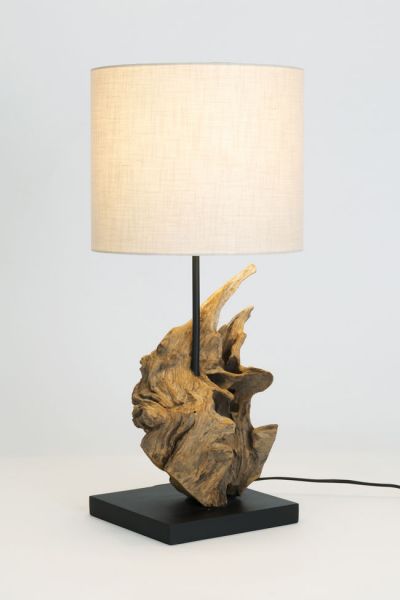Materiál: přírodní akáciové kořenové dřevo, textilní stínidlo s lněnou strukturou, kovový podstavec v černé barvě