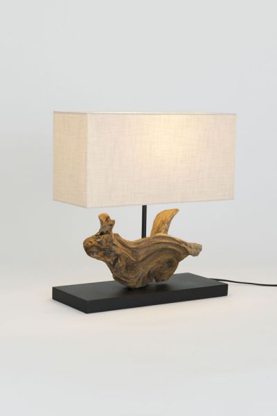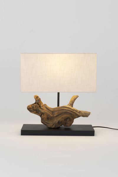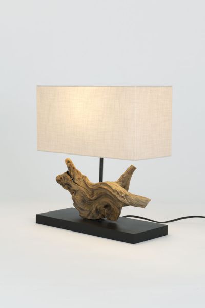 Materiál: přírodní akáciové kořenové dřevo, textilní stínidlo s lněnou strukturou