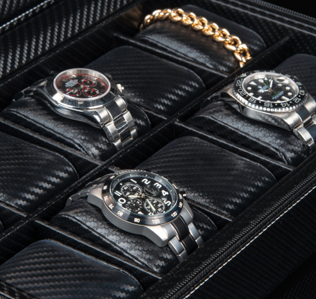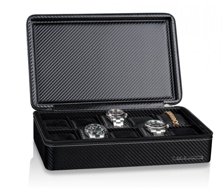 Ať už cestujete nebo doma, box Tampa nabízí dokonalou kombinaci ochrany, stylu a funkčnosti. Lehká podšívka z vysoce kvalitního vnějšího materiálu karbonového vzhledu chrání vaše cenné hodinky před nárazy a poškrábáním a zároveň dodává nádech sportovní elegance. Vaše hodinky drží na měkkých polštářcích s velkorysou šířkou 50 mm a obvodem 190 mm. Tyto polštářky jsou speciálně navrženy tak, aby udržely vaše hodinky v bezpečí a pohodlí, aby byly vždy v perfektním stavu.