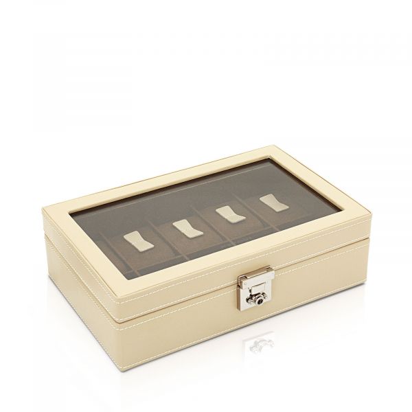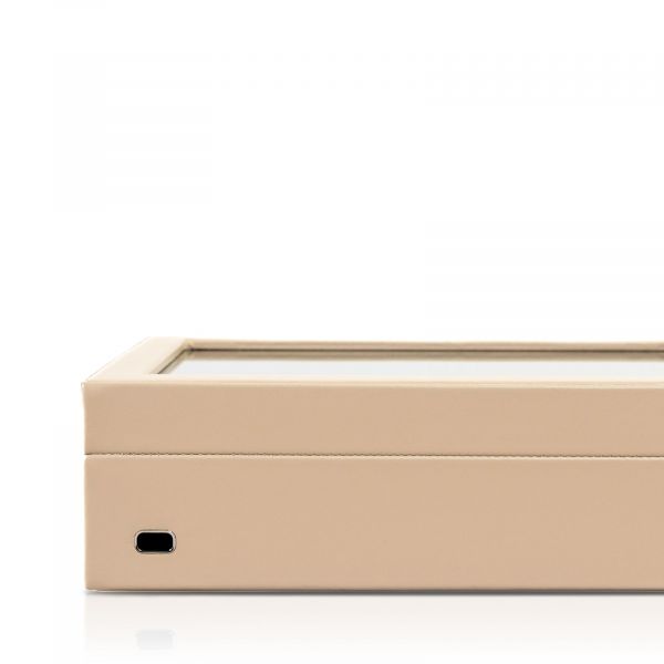 • materiál: kůže, interiér velour • skleněné průhledové okno • zavírání na uzamykatelný zámeček • objímky na hodinky 16-19,5cm • na zadní straně boxu je otvor pro napájecí kabel pro Smart Watch