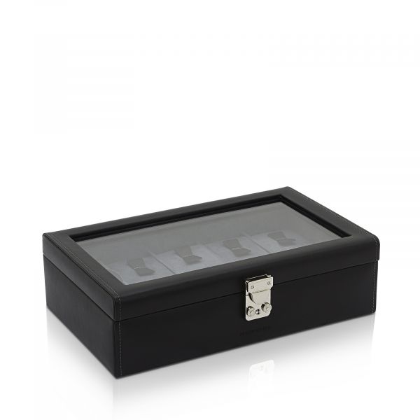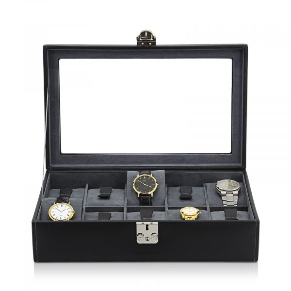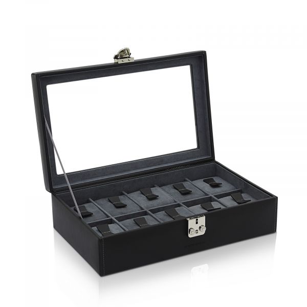 Box na hodinky Infinity pro 10 hodinek, vyrobený z vysoce kvalitní kůže s podšívkou z měkkého veluru. Průhledové okénko nabízí jasný výhled na vaše hodinky.
