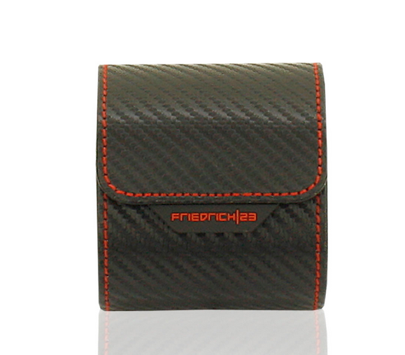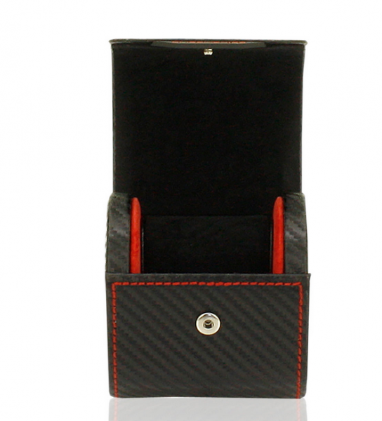Pouzdro na jedny hodinky z jemné syntetiky v karbonu, kontrastní prošití.