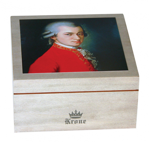 Wolfgang Amadeus Mozart byl klasicistní hudební skladatel a klavírní virtuos, geniální hudebník, který za svého života složil 626 děl světského i duchovního charakteru. Ve svém dětství koncertoval po celé Evropě. Poté, co opustil pozici dvorního skladatele v Salzburgu, nenalezl již přes svou proslulost stálé placené místo pro zajištění existence své rodiny. Nechtěl sloužit jako lokaj aristokratické společnosti a přál si zůstat svobodným umělcem. Mezi jeho nejproslulejší díla se řadí opery Figarova svatba a Don Giovanni a jeho poslední monumentální, i když nedokončený opus Requiem d moll. Ručně malované víčko a barel z perleti zobrazují scénu, kdy šestiletý Mozart hraje na klavír obklopen davem uchvácených lidí. Pero má malý hudební kousek, který hraje ukázku z "Malé noční hudby". Malá rezonanční deska umožňuje poslech části skladby.