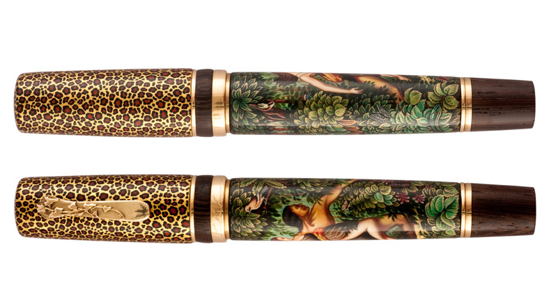 Tarzan je literární postava, hlavní hrdina cyklu dobrodružných knih amerického spisovatele Edgara Rice Burroughse. Cyklus líčí osudy potomka anglického lorda Greystoka, kterého po tragické smrti jeho rodičů v Africe vychovává pralesní opice a který se brzy díky své síle a důvtipu stane nejmocnějším tvorem džungle. Další části série vyprávějí o jeho návratu do civilizace, kde se vlivem lásky k mladé Američance změní v gentlemana. Skládá se celkem z 24 dílů, z nichž dva vyšly až po smrti autora. Víčko je pečlivě ručně malováno s leopardím designem. Na zlatém klipu jsou zobrazeny trojrozměrně pralesní liány. Na víčku jsou dva pásky, jeden je z exotického dřeva wengé, na druhém zlatém pásku je vyryt podpis Burroughse. Ručně malovaný barel zobrazuje známou scénu houpajícího se Tarzana, který drží Jane. Zakončení barelu je také z wengé dřeva. Pístové plnění Velikost hrotu: F, M, B