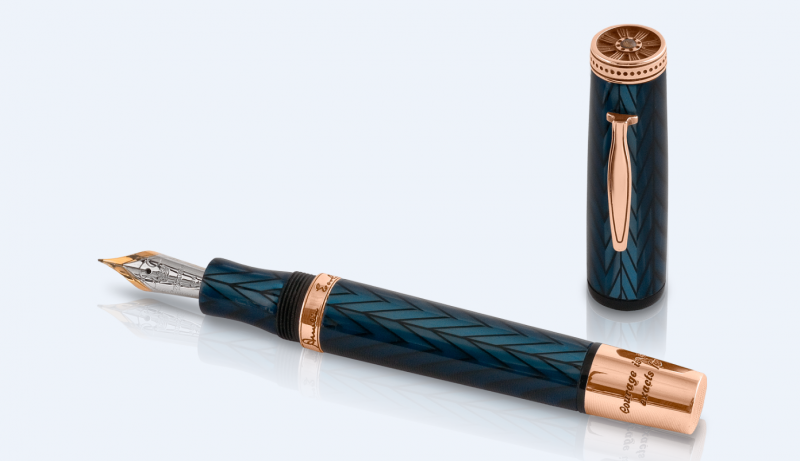 Tento velkolepý psací nástroj se skládá z unikátní trojrozměrné břidlice modré a černé s celuloidem ve vzoru rybí kosti.