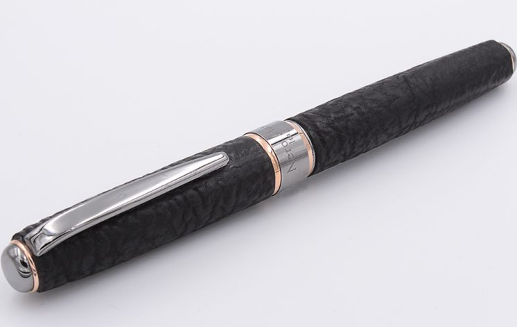 Ručně vyrobený roller zkušenými italskými řemeslníky. Roller je potažen pravou žraločí kůží černé lávové barvy. Kovové části jsou vyrobeny z pevného mincovního stříbra s puncem 925.