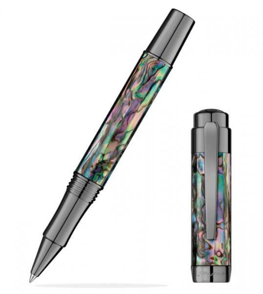 Nová kolekce Abalone od Labanu je skutečným darem z moře. Fasetované tělo a víčko pera jsou pečlivě potaženy jemnými plátky autentické mušle z Nového Zélandu. Povrchová úprava mušle má prchavou krásu, která se třpytí v duze vířících iridescentních barev. Okouzlující mušle je zvýrazněna vysoce leštěným chromem nebo matným bronzem na pružinové sponě a ozdobném lemování.