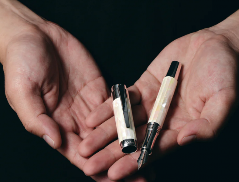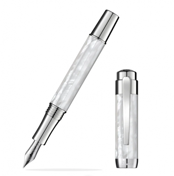Čepička je vyrobena z perleťové mušle a pryskyřičného laku a zdobena stříbrnou sponou a medailonem na horní části víčka. • plnicí systém: kartuše a konvertor