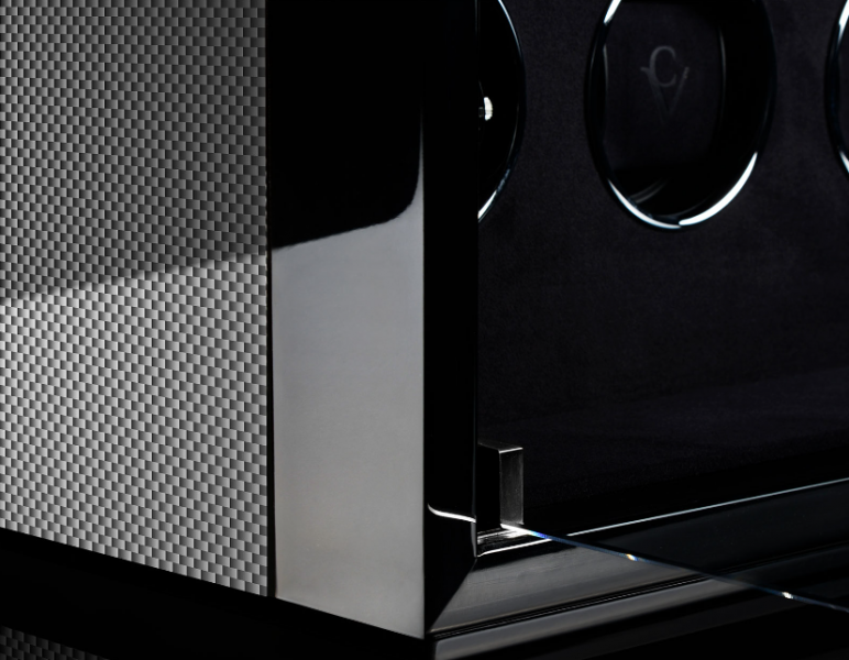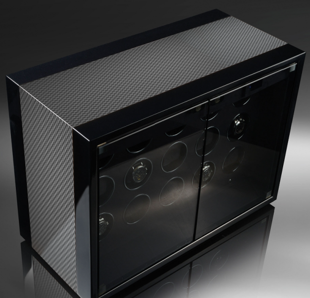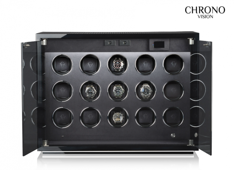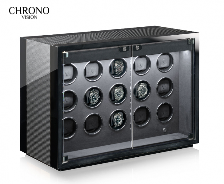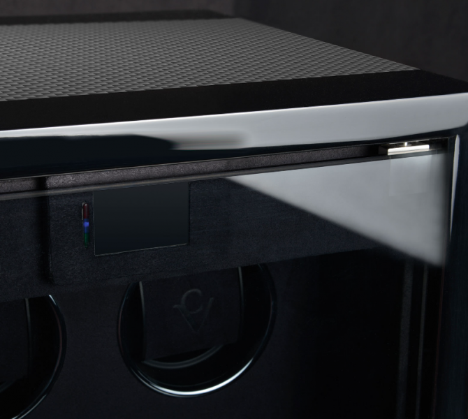Stolní modely z řady Ambiance nabízejí sběratelům hodinek perfektní pódium pro kvalitní prezentaci jejich pokladů. Dvě stmívatelná LED světla efektně zvýrazňují modely Ambiance: Zatímco vnitřní osvětlení odhaluje hodiny skryté za kouřovým sklem, ambientní osvětlení integrované do podstavce decentně podtrhuje elegantní vzhled objektu. • materiál dřevo/MDF • interiér velour Technické parametry • stop pozice 12 hodin, ambientní světlo, stmívatelné LED vnitřní osvětlení, modulární rozšiřitelný systém, fáze spánku, rychlé natahování, samostatně programovatelné motory pro každé hodiny, synchronní chod • samostatně zapínatelné osvětlení, průhledové okénko • možnost uzamčení • ovládání pomocí app/bluetooth • počet volitelných otáček: 500…-2 500 (v krocích po 50), 500…-2 650 (v krocích po 50), 550…-2 650 (v krocích po 50) • síťové napájení • šířka objímky: 5,5cm • obvod objímky: 15cm Rozměr: 46x62x30cm Hmotnost: cca 35kg