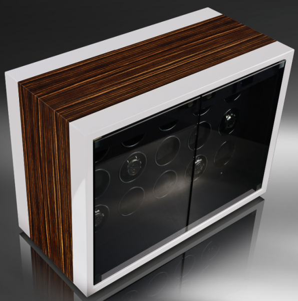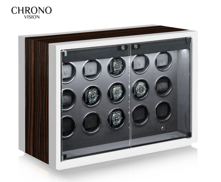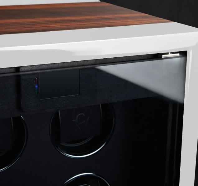 Stolní modely z řady Ambiance nabízejí sběratelům hodinek perfektní pódium pro kvalitní prezentaci jejich pokladů. Dvě stmívatelná LED světla efektně zvýrazňují modely Ambiance: Zatímco vnitřní osvětlení odhaluje hodiny skryté za kouřovým sklem, ambientní osvětlení integrované do podstavce decentně podtrhuje elegantní vzhled objektu. • materiál dřevo/MDF • interiér velour Technické parametry • stop pozice 12 hodin, ambientní světlo, stmívatelné LED vnitřní osvětlení, modulární rozšiřitelný systém, fáze spánku, rychlé natahování, samostatně programovatelné motory pro každé hodiny, synchronní chod • samostatně zapínatelné osvětlení, průhledové okénko • možnost uzamčení • ovládání pomocí app/bluetooth • počet volitelných otáček: 500…-2 500 (v krocích po 50), 500…-2 650 (v krocích po 50), 550…-2 650 (v krocích po 50) • síťové napájení • šířka objímky: 5,5cm • obvod objímky: 15cm Rozměr: 46x62x30cm Hmotnost: cca 35kg