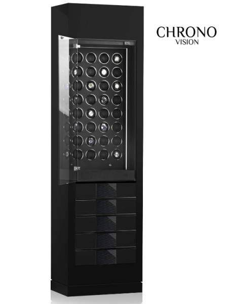 Skříně Momentum jsou působivě velký, funkční designový nábytek pro ambiciózní sběratele. Jeho lineární design s elegantními povrchovými úpravami, kouzlo velkorysých skleněných ploch a jasnost linie jsou výrazem úžasně přísného řemeslného řádu. Váš cenný obsah je skryt před zraky ostatních díky bezpečnému zasklení. Teprve když LED osvětlení osvětlí interiér, zviditelní se cenná sbírka. Bezpečnost hodinek za zasklením zaručuje kvalitní skener prstů od safe technology, který ovládá systém zámku. • materiál dřevo/MDF • interiér velour