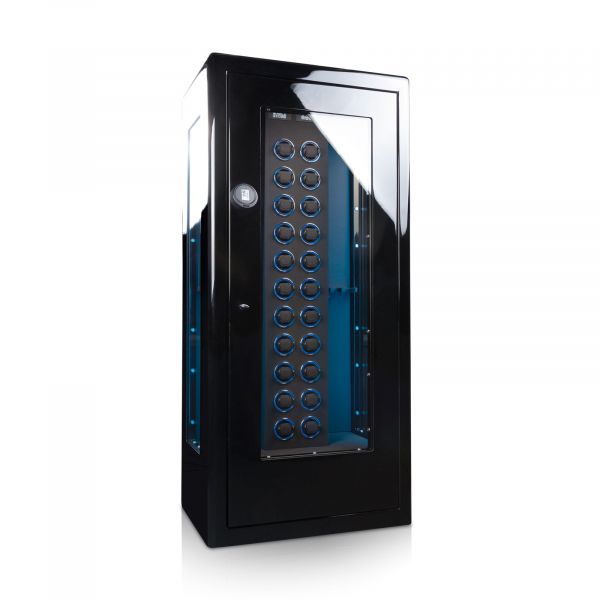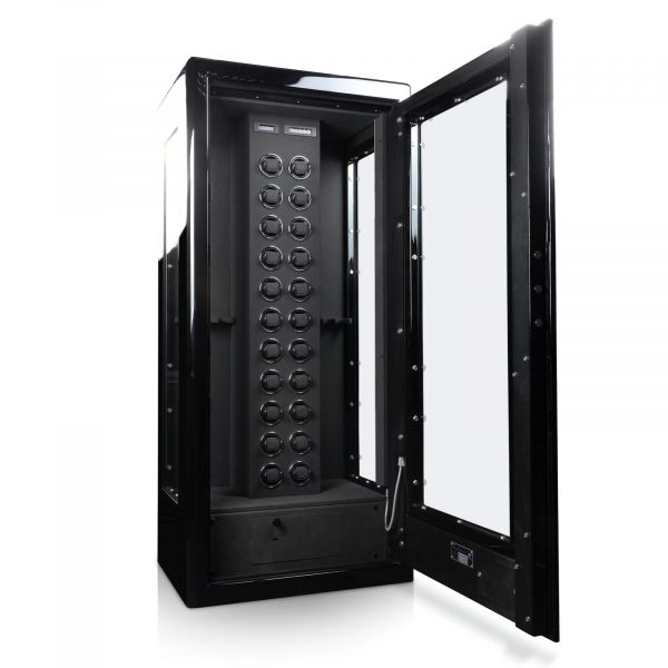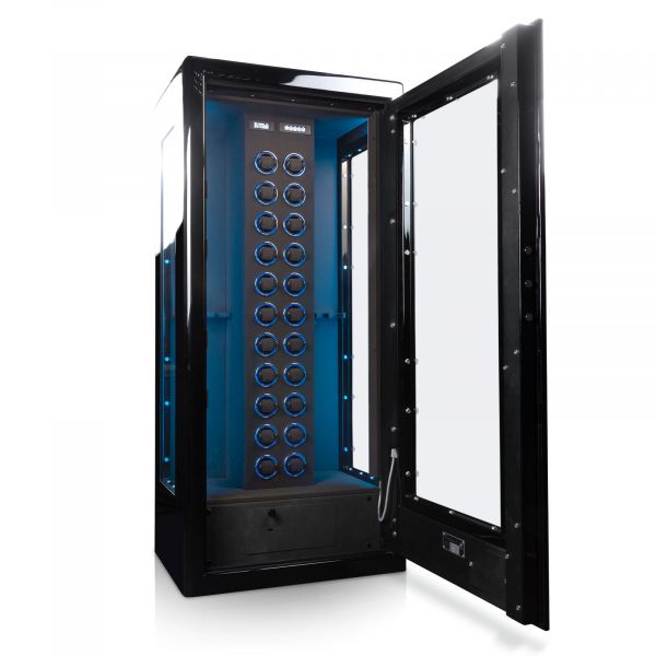 Parametry: • materiál ocel, interiér dřevený korpus,velour • 22 natahovačů hodinek, jednotlivě nastavitelné motorky • počet možných otáček za den: 450/550/650/750/850/950/1250/1500 • vnitřní LED osvětlení, samostatně zapínatelné • uzamykatelný zámek • ovládání - LCD displej, Touch displej • typ zámku - elektronický zámek s mechanickou revizí Stupeň odolnosti dle EN 1143-1 - WG1 Rozměr: 140x84x54cm Hmotnost: 313kg